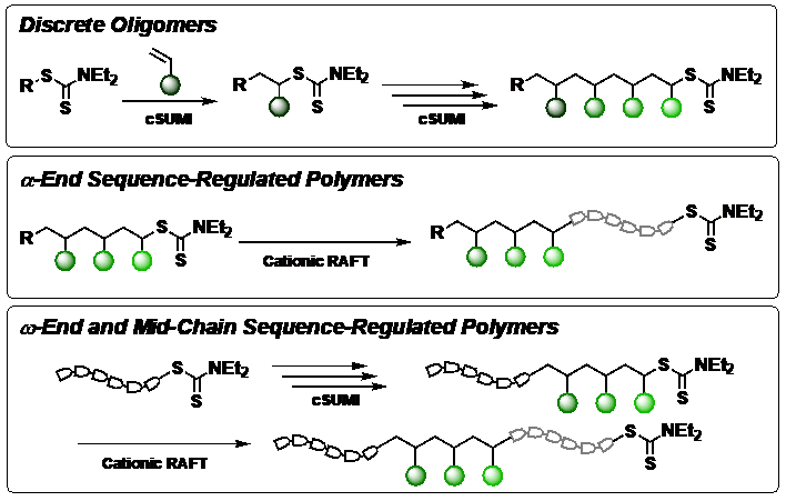 该团队首次开发了一种基于阳离子机制的SUMI策略(cSUMI)。cSUMI通过基于阳离子的链转移过程以及类似于自由基SUMI的可逆失活来运作。通过(1)使用具有高链转移常数的二硫代氨基甲酸酯做为链转移剂(CTA),(2)选择具有高给电子R基团的CTA与具有低给电子能力的单体,实现了乙烯醚和苯乙烯单体的高效cSUMI。在此基础上,还合成了一系列含有乙烯醚和苯乙烯基团的序列精确寡聚物,以及α-/ω-端和链内序列可控聚合物,其中大部分是自由基SUMI无法实现的。此外,还探索了这些序列调控聚合物在miktoarm星形聚合物的制备、光敏剂的输送和荧光探针的增溶等方面的应用。做为一种新机理的SUMI,必将拓宽精密乙烯基聚合物结构和序列的研究范围。