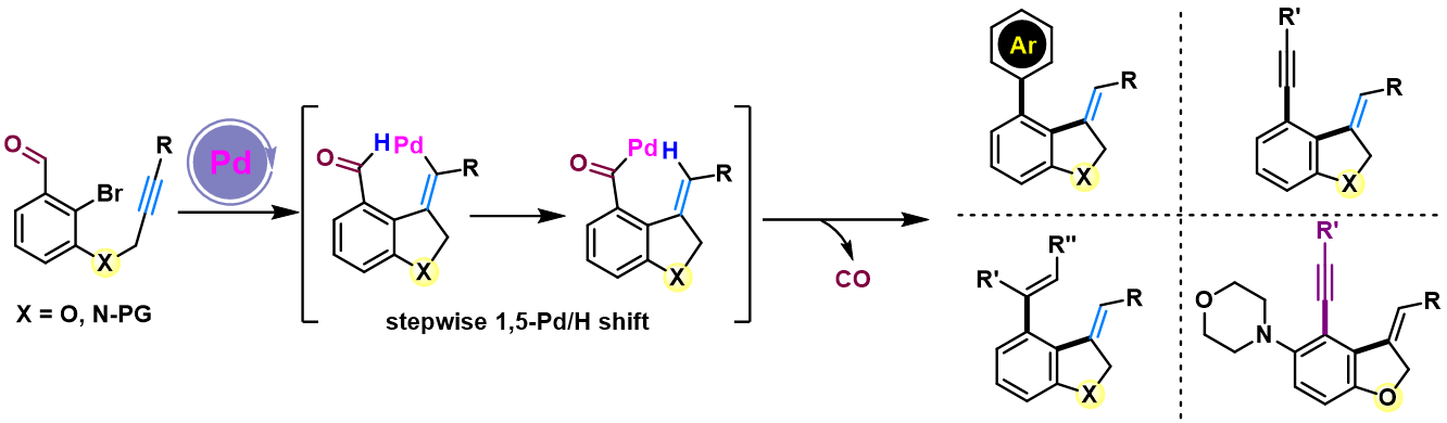 1,4-钯/氢迁移是实现远程选择性C-H键活化的重要方法。在前期研究中,黄学良课题组发展了卡宾桥联C-H键活化反应策略(Carbene Bridging C-H Activation, CBA)。基于CBA策略可以实现卡宾迁移插入促进的1,4-钯/氢迁移反应,发展了构建了异香豆素、七、八元环内脂和七元环内酰胺以及苯并异喹啉酮等类化合物的新方法(Angew. Chem. Int. Ed.2018,57, 319;Nat. Commun.2020,11, 461;Angew. Chem. Int. Ed.2020,59, 18261;ACS Catal.2021,11, 1570;Cell Rep. Phys. Sci.2022,3,100776)。相较于1,4-钯/氢迁移的广泛报道,关于1,5-钯迁移的研究报导较少,究其原因可能在于其过渡态六元钯环更容易发生还原消除得到五元环产物。基于前期研究,作者近期发展了炔烃桥联的C-H键活化策略(Alkyne Bridging C-H Activation),实现了从烯基至醛基碳氢键的1,5-钯/氢迁移。通过该1,5-钯/氢迁移串联脱羰芳基化、脱羰烯基化/脱羰炔基化和脱羰Catellani反应,作者发展了合成苯并二氢呋喃和苯并吲哚啉衍生物的新方法。