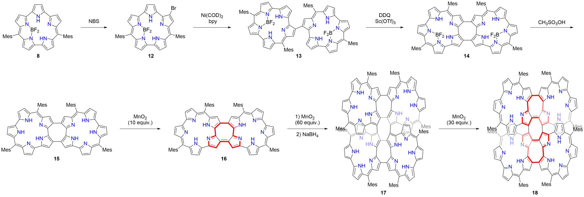 扩环卟啉因其灵活的结构、多样的π电子回路,丰富的配位化学性质及有趣的反应活性而受到广泛的关注。鉴于扩环卟啉的应用前景,实现扩环卟啉的氧化自偶联反应具有重大意义,该类反应有望为构建基于扩环卟啉低聚物的功能系统开辟一条简洁高效的途径。然而,与卟啉和咔咯相比,扩环卟啉的氧化自偶联反应却鲜有报道。