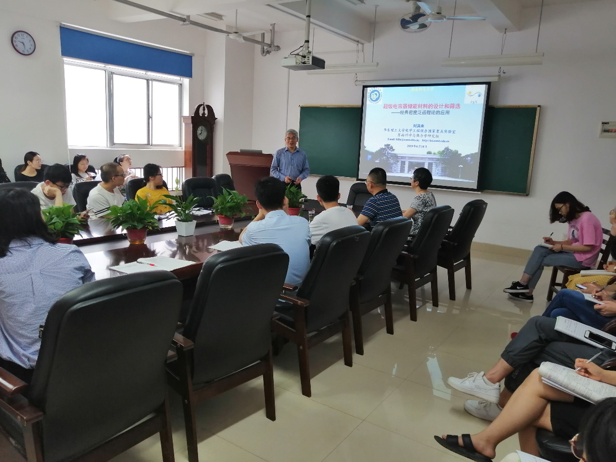 2019年6月18日上午9:30,华东理工大学刘洪来教授来我室讲学,为我室师生带来一场题为“超级电容器储能材料的设计和筛选”的学术报告。报告由我院南延青教授主持,实验室部分老师以及研究生聆听了此次报告。