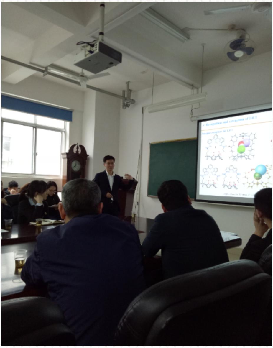 何清教授分别从博士后与博士两个阶段进行学术成果展示与交流。何教授着重讲述了诸如智能超分子受体对LiCl进行萃取等前沿性研究成果。从课题的选取到智能受体的设计、合成,再到其应用,何教授的科研经历向我们展示了一个完整而又清晰的由目标到实现的过程,对老师和同学们从事科研有很大的启示。报告结束,听众反响热烈,老师和同学们提问积极踊跃,何教授耐心回答了每一个问题,他的学识与见地获得听众此起彼伏的掌声。会后,徐广宇、周明波等老师反响热烈,与何教授进一步探讨学术方面问题。