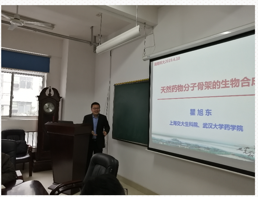 2019年4月11日下午15:30上海交通大学瞿旭东教授在我院206会议室为我室师生带来了一场题为“天然药物惰性分子骨架的生物合成”的学术报告,报告由我室学科带头人陈波教授主持,实验室部分老师、研究生聆听了此次报告。