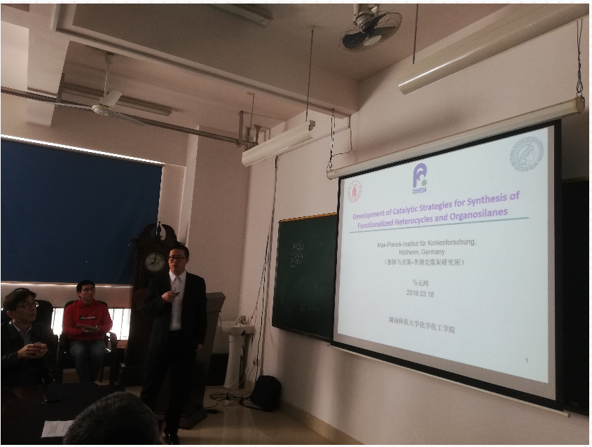 2019年3月18日下午14:30德国马克斯-普朗克煤炭研究所马元鸿博士在太阳网集团tcy8722206会议室为我院师生带来了一场题为“Development of Catalytic Strategies for Synthesis of Functionalized Heterocycles and Organosilanes”的学术报告。该报告由我院副院长宋建新教授主持,部分老师和研究生积极参与了此次报告。