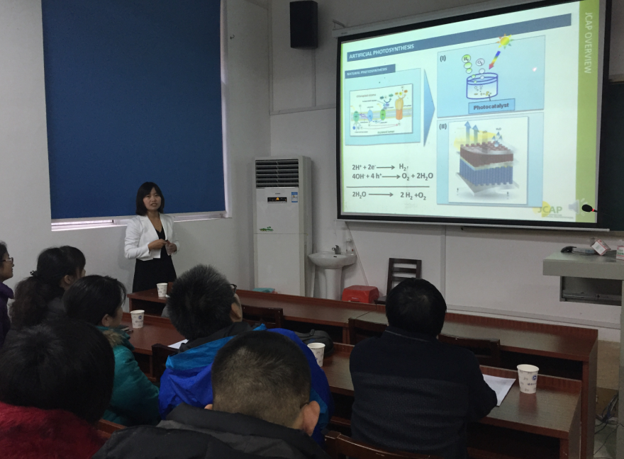 杨金辉博士做了以“人工光合作用中水解的催化”为题的精彩学术报告。该报告首先简单介绍了能源需要和环境双重考虑来实现太阳能利用的背景;其次介绍了两个模型:分别是纳米粒子体系加入水中实现H2O转化为H2和O2的半导体材料和薄层膜类似于太阳能电池使H2、O2分开产生的叠层材料;再进一步介绍叠层材料及其三要素,还考察了温度等条件的影响。最后介绍了其科研团队并鼓励学生以勤奋严谨的态度进行科研。