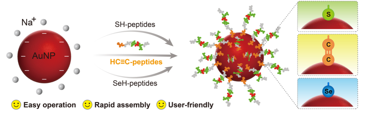 金纳米颗粒(AuNPs)因其独特的物理化学特性而备受关注,包括高消光系数、优异的生物相容性、尺寸依赖的光学特性以及高效的荧光共振能量转移(FRET)能力。基于这些特性,研究者们通常通过金-巯(Au-S)共价键将各类功能分子(如抗体、适配体、多肽和聚合物等)修饰到AuNPs表面,构建多功能纳米探针。这些功能化的AuNPs在生物传感、细胞成像、药物递送和疾病治疗等领域展现出巨大的应用潜力。然而,Au-S键固有的化学不稳定性限...