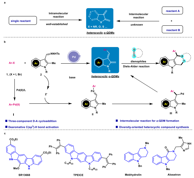 近日,太阳网集团tcy8722黄学良教授课题组在桥联C-H键活化研究方面取得了新的进展,在《Nature Communications》发表了题为“Three-component diels-alder reaction through palladium carbene migratory insertion enabled dearomative C(sp3)-H bond activation”的学术论文。邻二亚甲基醌(o-QDM)是一种高活性瞬态物种,可以作为双烯体参与Diels-Alder (D-A)反应。开发实用且有效的策略生成邻二亚甲基醌物种具有重要意义。目前,已...